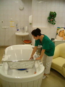 Sala do porodów w wodzie posiada wannę z hydro-masażem, masażem powietrznym, oparciem pod nogi, specjalną poręczą , jest tak wyprofilowana aby ułatwić pozycję podczas porodu. W czasie przerwy miedzy skurczami może korzystać z wertykalnych form porodu – w pozycji pionowej, może chodzić, skorzystać z worka sako, stołeczka porodowego , z ćwiczeń przy drabince, z piłki porodowej a nawet wykonać proste ćwiczenia gimnastyczne , po prostu być aktywna.