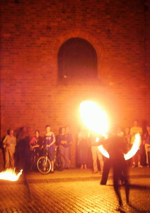 Niecodzienny pokaz tańca z ogniem zaprezentowała młodzież, uczestnicząca w warsztatach fire show, towarzyszących Biesiadzie Folkloru. Dwudziestominutowy pokaz przy świetnie dobranej muzyce i scenerii dostarczył widzom niezapomnianych wrażeń.