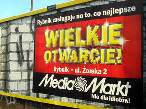 Opawska, główna ulica handlowa w mieście. Mury, tzw. małego targowiska oblepione plakatem, ze śmietniskiem w tle i ogromnym krzyczącym napisem: „NA TO SOBIE RYBNIK NIE ZASŁUŻYŁ!”. Kilka dni temu słowa te przykryły inne: „RYBNIK ZASŁUGUJE NA TO, CO NAJLEPSZE!”, zapraszając do jednego z tamtejszych sklepów z artykułami elektronicznymi. „Zapomnij o raciborskich marketach! U sąsiadów jest lepiej, taniej, przyjemniej!” – stwierdza mieszkaniec widzący plakat? Między tymi dwoma stwierdzeniami można postawić znak równości. Takie zaproszenie do Rybnika (czyt. wyjazd z Raciborza, rezygnacja z zakupów na miejscu) chyba naszemu miastu nie sprzyja…?