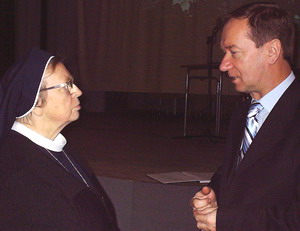 Popatrz na to zdjęcie normalnie: ot, poseł rozmawia z siostrą zakonną. Wyobraź sobie, że obok stoi poseł Siedlaczek i rozmawia z księdzem. Na spotkaniu byli duchowni i świeccy. Mieli okazję rozmawiać o wykładach, o swoich planach i o tym, co można zrobić dla Raciborza.