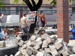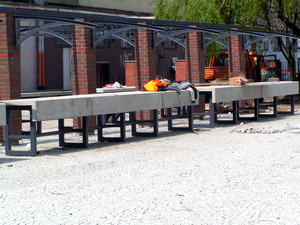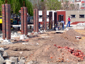 Trwa realizacja pierwszej części robót polegającej na wykonaniu nowej konstrukcji straganów otwartych mieszczących się na terenie małego targowiska (lewa strona placu) oraz wymianie nawierzchni na kostkę granitową. W straganach mieścić się będą 44 stałe punkty sprzedaży, przeznaczone przede wszystkim do handlu płodami rolnymi z własnej produkcji, sprzedaży kwiatów itp.
