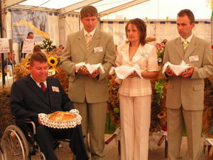 Pod namiotem, gdzie wyeksponowano wiejskie korony, nastąpiło uroczyste rozpoczęcie obchodów. Wój Gminy Kryzanowic Leonard Fulneczek dziękował rolnikom za włożyny wysiłek w pracę na roli oraz w organizację imprezy. Szczególnie wyróżnił panią Urszulę Fas, która, jak wspomniał, była mózgiem w komitecie organizacyjnym dożynek. Starosta Jerzy Wziontek nawiązał w przemówieniu do licznych nieprzychylności aury, z jaką borykali się w tym roku rolnicy. Zauważył taż, ze mimo mokrej i długiej zimy, deszczowej wiosny oraz suszy w lipcu plony zebrano zadawalające. Głównie dzięki wysokiej kulturze rolnej produkcji. Zabrał głos również poseł Henryk Siedlaczek, który podziękował rolnikom za wysiłek i błogosławił ich pracy. Starości dożynkowi, wybrani spośród gospodarzy, przekazali władarzom chleb upieczony z tegorocznej mąki, który wspólnie potem rozdali symbolicznie na poczęstunek zebranym gościom. W dalszej części festynu, przy domowych wypiekach, kawie, piwku i akampaniamencie zespołów wokalnych oraz popisach tanecznych goście bawili się do późnego wieczora.