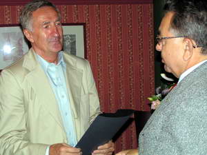 Prezydent Jan Osuchowski gratuluje trenerowi Karolowi Szynolowi