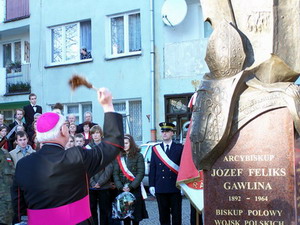 Feliksa Gawliny. Poświęcił go Abp Szczepan Wesoły z Rzymu. Obejrzyj też naszą wideorelację. W pięknej, choć nietypowej aurze jak na tę porę roku, około południa przy raciborskim Rynku rozpoczęły się obchody odsłonięcia pomnika abpa Józefa Feliksa Gawliny – biskupa polowego Wojsk Polskich, opiekuna polskiej emigracji. Wielu polityków, przedstawicieli władz nie tylko raciborskich, instytucji, duchowieństwo, młodzież szkolna, setki raciborzan przy dźwiękach patriotycznych utworów w wykonaniu orkiestry dętej Plania oczekiwali na odsłonięcie 5 – metrowego postumentu.