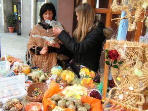 Barwne pisanki, baranki z waty, tekturowe kurczaki i całą gamę innych wielkanocnych ozdób oferują przechodniom w świątecznym kiermaszu pracownicy i uczestnicy warsztatów terapii zajęciowej RCRON – u.