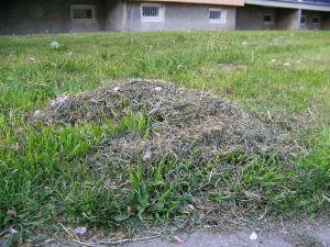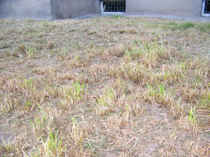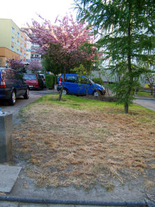 Osiedle na początku maja, po ciężkiej walce z wrażymi źdźbłami. Zwycięstwo na całej linii. Trawa padła, żółte, suche badyle sterczą tu i ówdzie… Widok jak na ściernisku po skoszonej pszenicy – ucieszyłby zapewne spracowanego rolnika… Chodniki porządnie odchwaszczone, a że trochę „chemii” wylało się na trawnik (tak z pół metra) – nie szkodzi. Kiedyś pewnie odrośnie… Podstawowe przykazania ogrodnicze dotyczące trawy zostały brutalnie podeptane jak sama trawa. Wielu może nie wie, albo nie chce wiedzieć, że nie należy kosić w czasie upałów, że skoszoną trawę trzeba zebrać jak najszybciej (a nie zostawiać na 3 dni), że nie należy ciąć zbyt nisko (a tymczasem kosiarki tną do samej gleby. Im niżej przecież, tym dłużej zielsko będzie rosło i nie trzeba będzie znów taszczyć traktora i jeździć w kółko między krzewami).