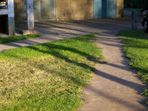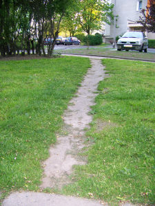 Ludność żwawo pomaga w wojnie z bezczelną przyrodą. Po cóż chodzić po chodniku, skoro „na skróty” trawnikiem będzie szybciej? Deptać! Deptać! Powoli ścieżyna rozrasta się, aż suche klepisko wyznaczy na zawsze nowy, „naturalny” trakt podróżny. Wyprowadzani na trawkę czworonożni pupile też robią wiele, by urozmaicić zieloną monotonię. – A gdzie niby ma srać? Panie! Przecież ja tego zbierać nie będę! – złości się zapytana „pani od wilczura”. W niepamięć odeszły tabliczki „Nie deptać trawy”, a szkoda, bo chyba trochę odstraszały (na marginesie, przypomniał mi się kawał: Pijany facet leży w parku na trawie obok tabliczki „Nie deptać trawników”. Podchodzi do niego policjant i mówi groźnie: – Przecież tu pisze, że nie można deptać trawników! – Ja nie depczę, ja leżę).