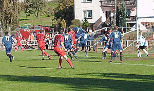 Piłkarze "Unii" odpowiedzieli serią główek po rzucie rożnym zakończoną spalonym oraz zablokowanym strzałem Kowalczyka. W 38 min niecelne podanie Pniewskiego na naszej połowie boiska przechwytuje Mościcki, natychmiast dogrywa do Dzierżengi, który strzela celnie i piłka dotykając słupka wpada do bramki. Do przerwy wynik nie ulega zmianie.