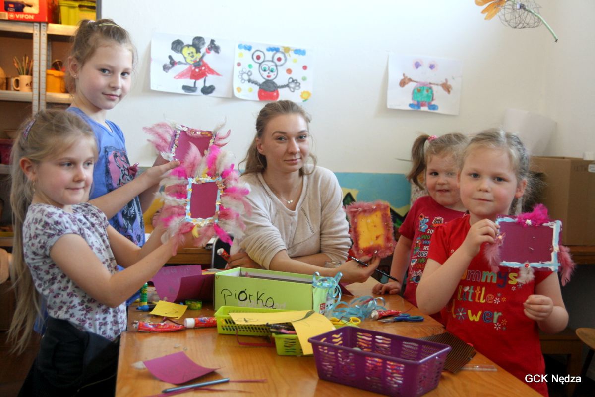 – Zajęcia prowadzi nasza wykwalifikowana i sympatyczna instruktorka Kasia Szymańska. Pierwsze 1,5 godziny to twórcze zajęcia plastyczne, z wykorzystaniem bogatej palety materiałów dostępnych w Gminnym Centrum Kultury. Piórka, guziczki, piękne skrawki artystycznych tapet zdobytych za bezcen, farby, papiery, kredki, materiały recyklingowe… Staramy się twórczo wykorzystać profesjonalne materiały przeznaczone do działań plastycznych oraz materiały z pozoru niezwiązane z plastyką – wyjaśniają w GCK.