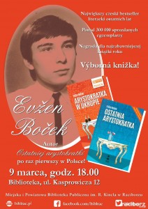 Prawdziwa gratka dla miłośników czeskiej literatury i czeskiego poczucia humoru. 9 marca o godz. 18:00 w bibliotece przy ul. Kasprowicza 12 odbędzie się spotkanie z Evženem Bočkem. Będzie to pierwsza wizyta pisarza w Polsce.