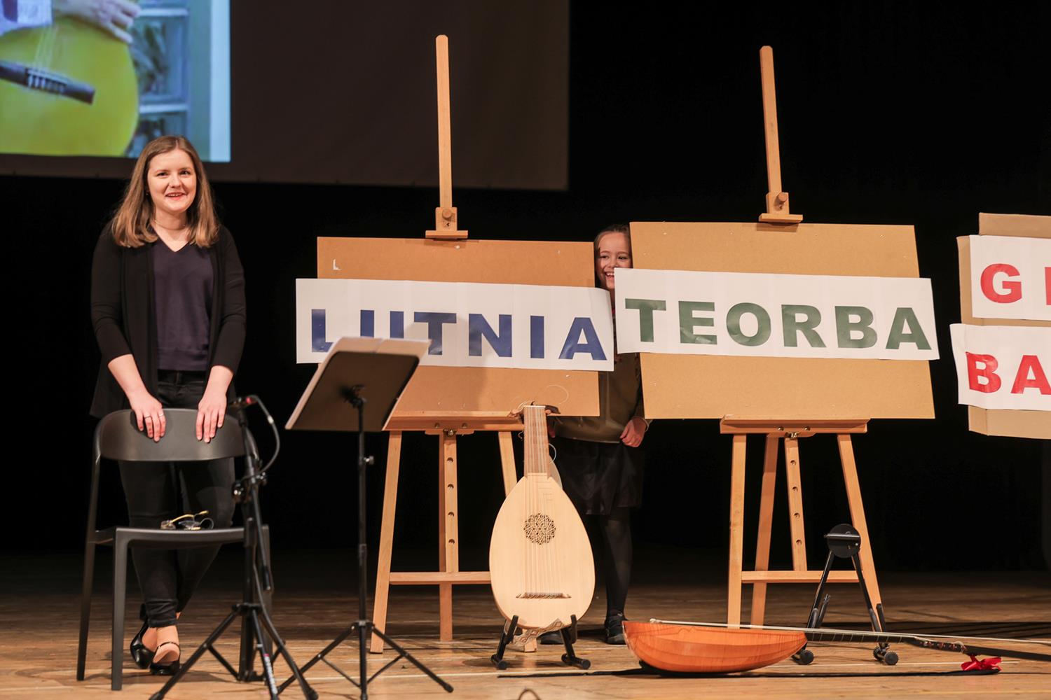 Nie tylko lutnia była bohaterem spotkania. Dzieci poznały również teorbę, zwaną arcylutnią – bardzo rzadko spotykany instrument basowy. Teorba, w przeciwieństwie do lutni, ma dwa gryfy – jeden bardzo długi, umożliwiający wydobycie niższych dźwięków, i drugi krótszy. Posiada łącznie 14 strun, które są jelitowe, co sprawia, że szybciej się rozstrajają. Na scenie pojawiła się także gitara barokowa, instrument popularny w XVII i pierwszej połowie XVIII w. Mniejsza od gitary klasycznej wybrzmiała w kompozycji „Fandango” autorstwa Santiago de Murcia.