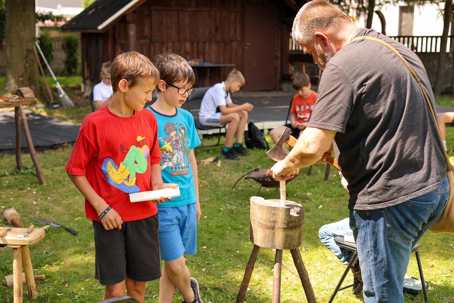 Wśród uczestników znalazło się 10 chłopców i jedna dziewczynka, którzy z zapałem zgłębiali tajniki pracy z drewnem. Pod czujnym okiem prowadzącego dzieci uczyły się zasad bezpiecznego posługiwania się narzędziami takimi jak dłuta, noże i siekierki. Warsztaty były również okazją do poznania różnych gatunków drzew i ich zastosowania w rękodziele. Dużo frajdę sprawiło im samodzielne przygotowywanie drewna. Uczestnicy, uzbrojeni w siekierki, tłuczki i piły, stworzyli półprodukty, by następnie przejść do najważniejszego etapu – wykonania własnej, unikalnej łyżki.