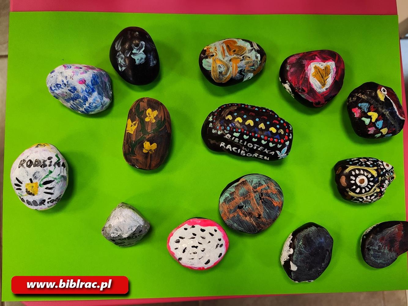 Uczestnicy warsztatów ozdabiali kamienie, które zabiorą ze sobą na wakacyjne wyjazdy. Na odwrocie każdego z nich znalazł się napis: „Biblioteka w Raciborzu – wróć do mnie”.
