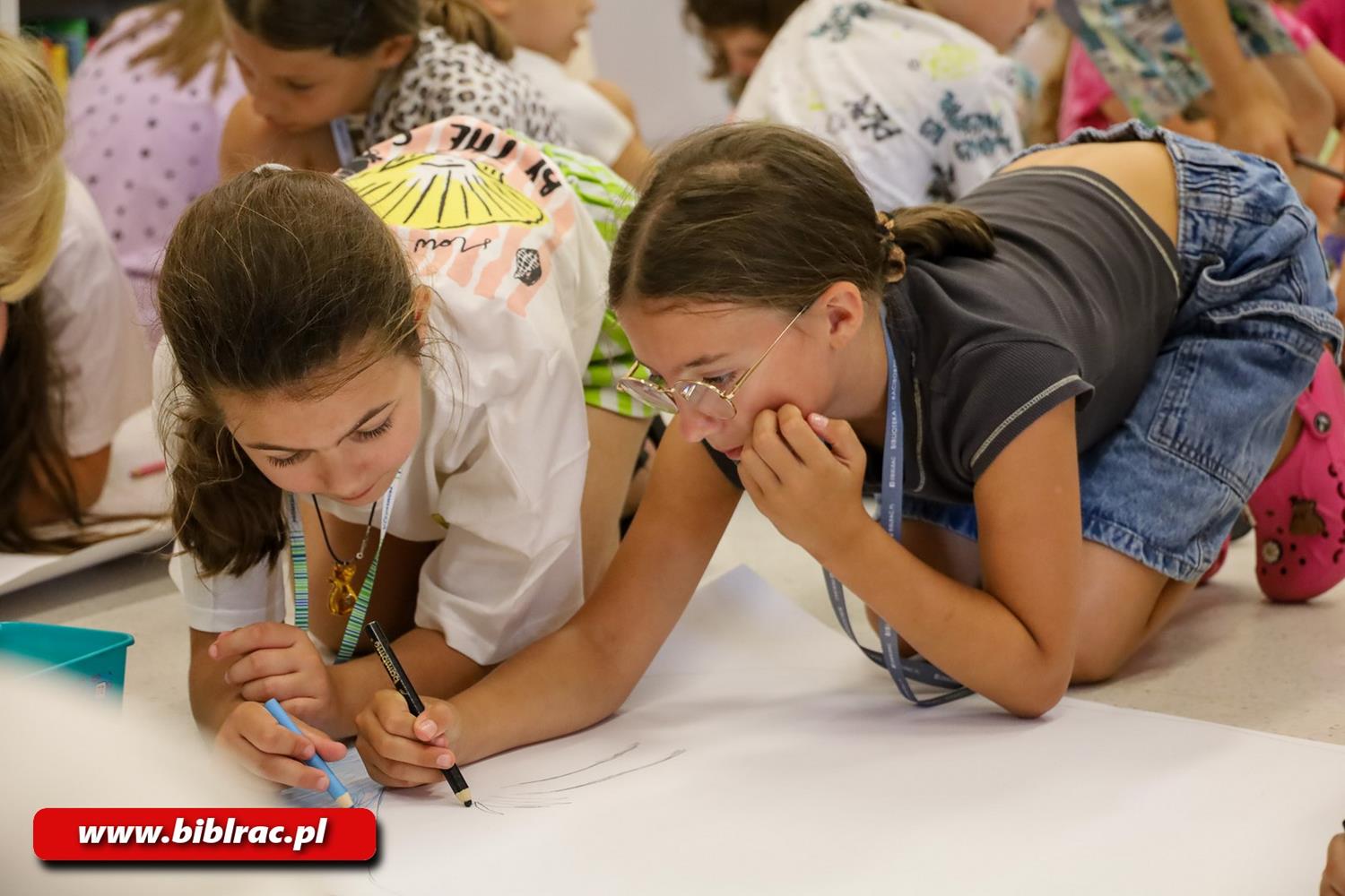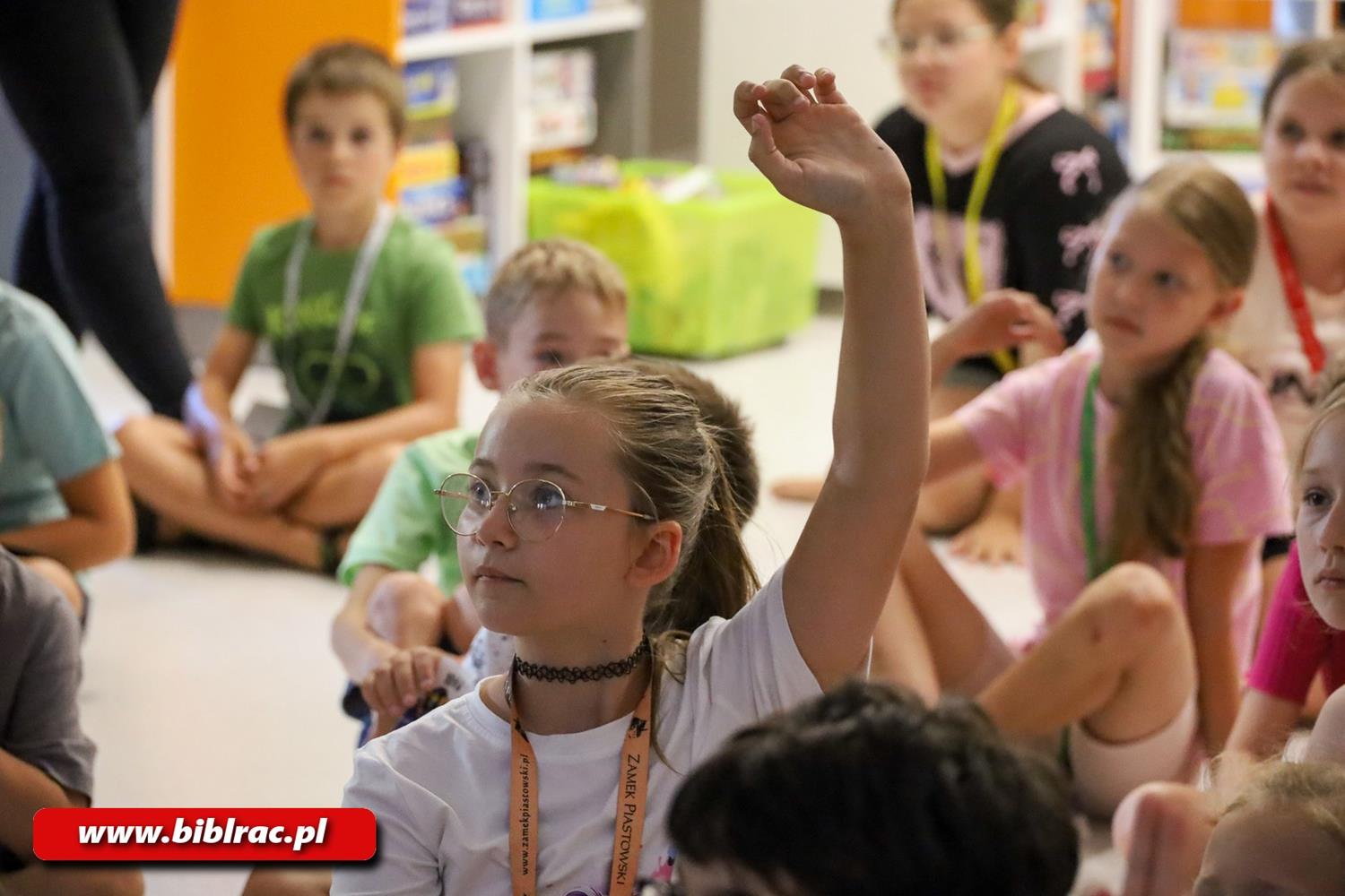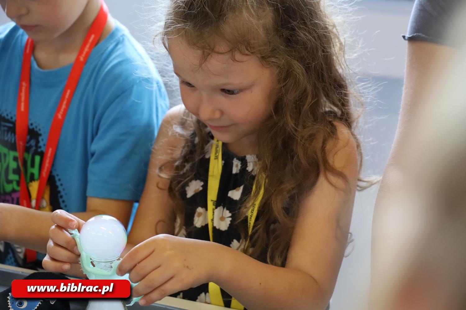 Czwartkowa wizyta w SOWIE – Strefie Odkrywania, Wyobraźni i Aktywności – przeniosła uczestników do bajkowego Arendelle. Dzięki eksperymentom z suchym lodem dzieci poznały jego niezwykłe właściwości, m.in. to, że nie topnieje, tylko sublimuje, osiąga temperaturę -78,5°C i tworzy efektowną mgłę. Te „lodowe czary” były wyjątkową atrakcją podczas upalnego dnia. Uczestnicy wykonali prace plastyczne przedstawiające zamrożone Arendelle, które można obejrzeć w bibliotecznej Galerii Gawra. Natomiast dziewczynki chętnie zrobiły sobie fryzury inspirowane Elsą.