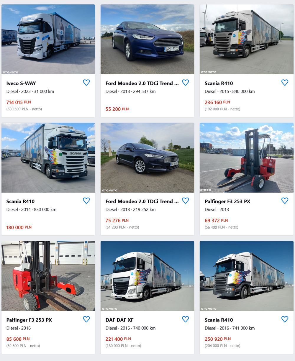 Na popularnym serwisie Otomoto pojawiło się kilkanaście ogłoszeń Eko-Okien, jednak łączna liczba wystawionych pojazdów jest znacznie większa. Firma sprzedaje szeroki asortyment aut, od ciężarowych po osobowe i busy. Wśród nich znajdują się m.in. ciężarówki – osiem zestawów Scania R410 z 2014 r. z naczepami, 14 zestawów ciężarowych DAF i 40 pojazdów Iveco. Wśród ofert znaleźć można również wózki widłowe. Flota przeznaczona na sprzedaż obejmuje także samochody osobowe – od popularnych Fordów i Volkswagenów po bardziej luksusowe modele. Wśród nich wyróżnia się biały minivan Lexus LM 350h z 2024 r. za pół miliona złotych, a także dwa Volkswageny Arteon oraz kilka modeli Passata i Mondeo. Wszystkie pojazdy, zgodnie z ogłoszeniami, pochodzą z firmowej floty i są w dobrym stanie technicznym.