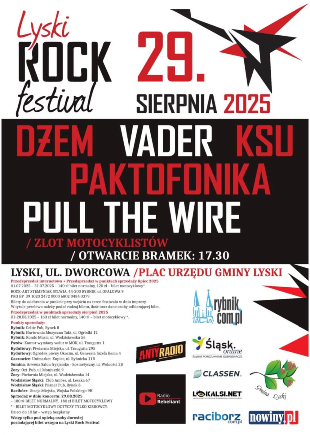 Na scenie pojawią się m.in. legendy polskiego rocka, metalu i hip-hopu: Dżem, Vader, KSU, Paktofonika i Pull The Wire. Organizatorzy zapowiadają również zlot motocyklistów. Otwarcie bram zaplanowano na godz. 17:30. Bilety w przedsprzedaży dostępne są w punktach sprzedaży oraz online, a cena wejściówki wynosi 160 zł (140 zł – bilet motocyklowy). W dniu wydarzenia bilety kosztować będą 180 zł.