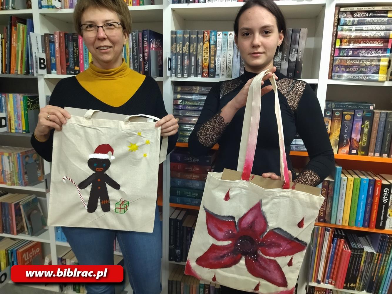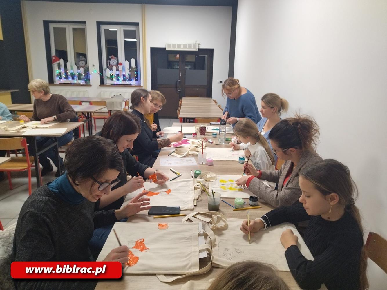 Biblioteka w Markowicach również przygotowała przedświąteczną ofertę. Uczestnicy warsztatów malowali ekologiczne, lniane torby farbami, korzystając z gotowych wzorów lub realizując własne projekty. W tej samej filii 3 grudnia odbyły się dodatkowe zajęcia plastyczne dla uczniów, podczas których dzieci malowały gipsowe figurki aniołów oraz przygotowywały leśne choinki zdobione brokatem, perełkami i innymi ozdobami.