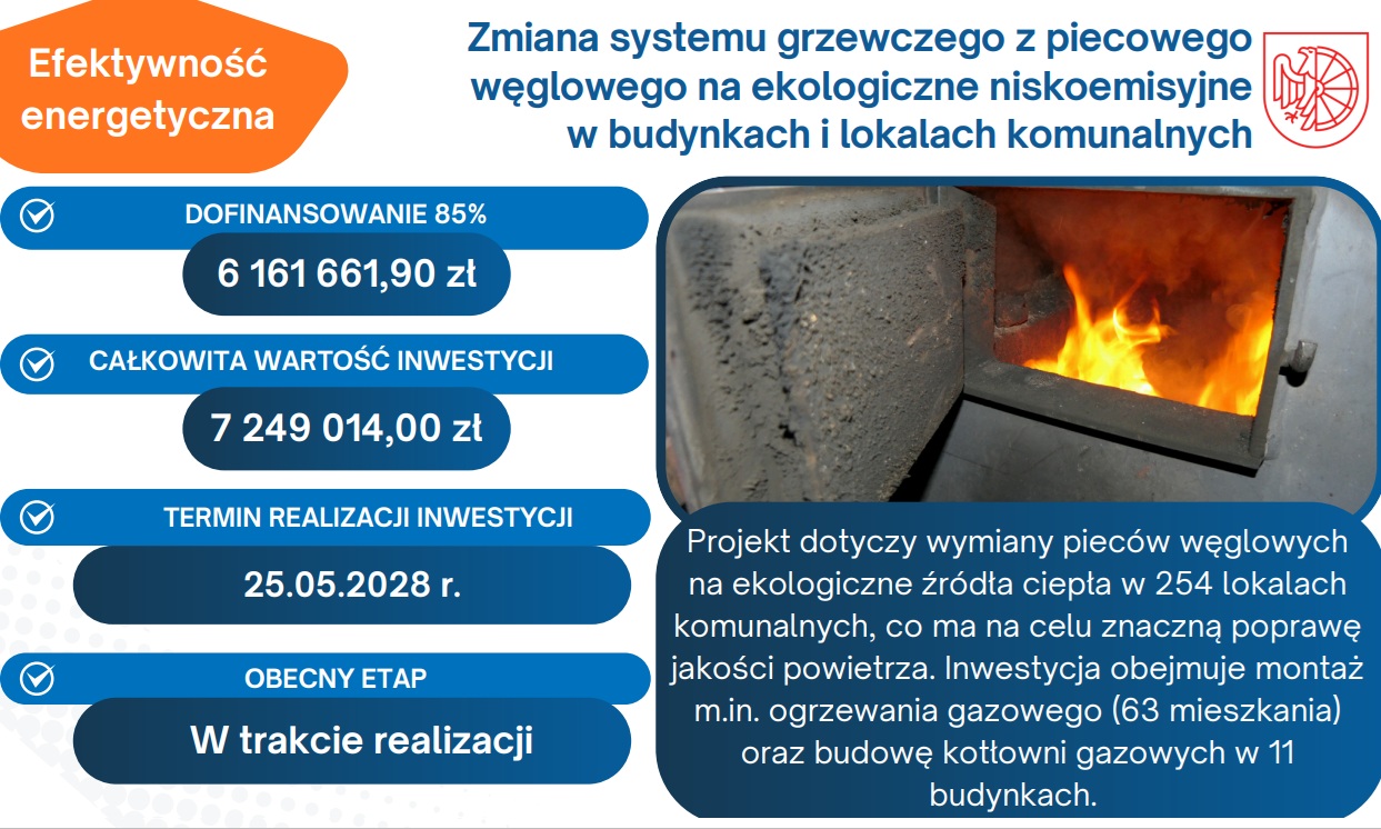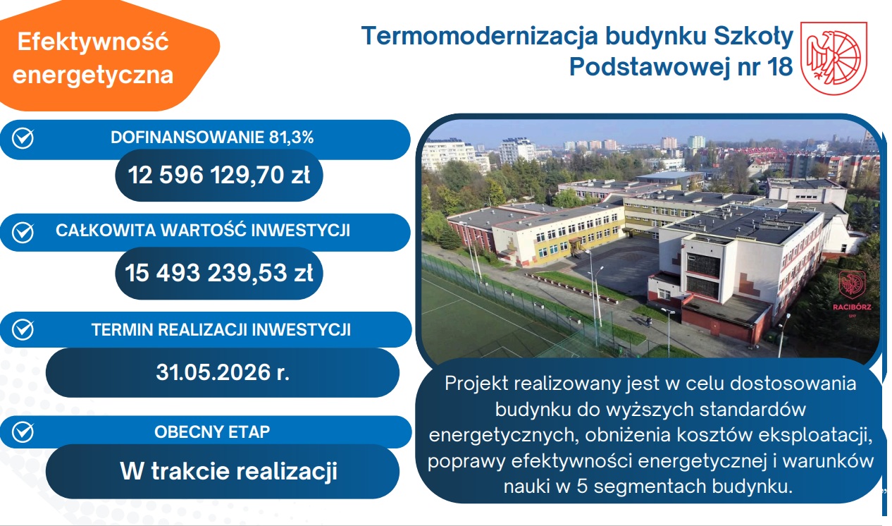 Wśród zaprezentowanych inwestycji znalazły się działania związane z rozwojem mobilności i infrastruktury drogowej, w tym budowa centrum przesiadkowego w rejonie dworca kolejowego, rozwój zrównoważonej mobilności miejskiej i zakup autobusów elektrycznych wraz z infrastrukturą do ich ładowania. Przedstawiono także plany przebudowy układu drogowego prowadzącego do terenów inwestycyjnych przy ul. Cieszyńskiej i modernizacji ul. Waryńskiego. Istotną część stanowią też projekty dotyczące efektywności energetycznej obejmujące montaż instalacji fotowoltaicznych na gminnych nieruchomościach, termomodernizację budynków użyteczności publicznej, w tym Centrum Rehabilitacji Osób Niepełnosprawnych i Szkoły Podstawowej nr 18, a także wymianę systemów grzewczych w zasobach komunalnych.