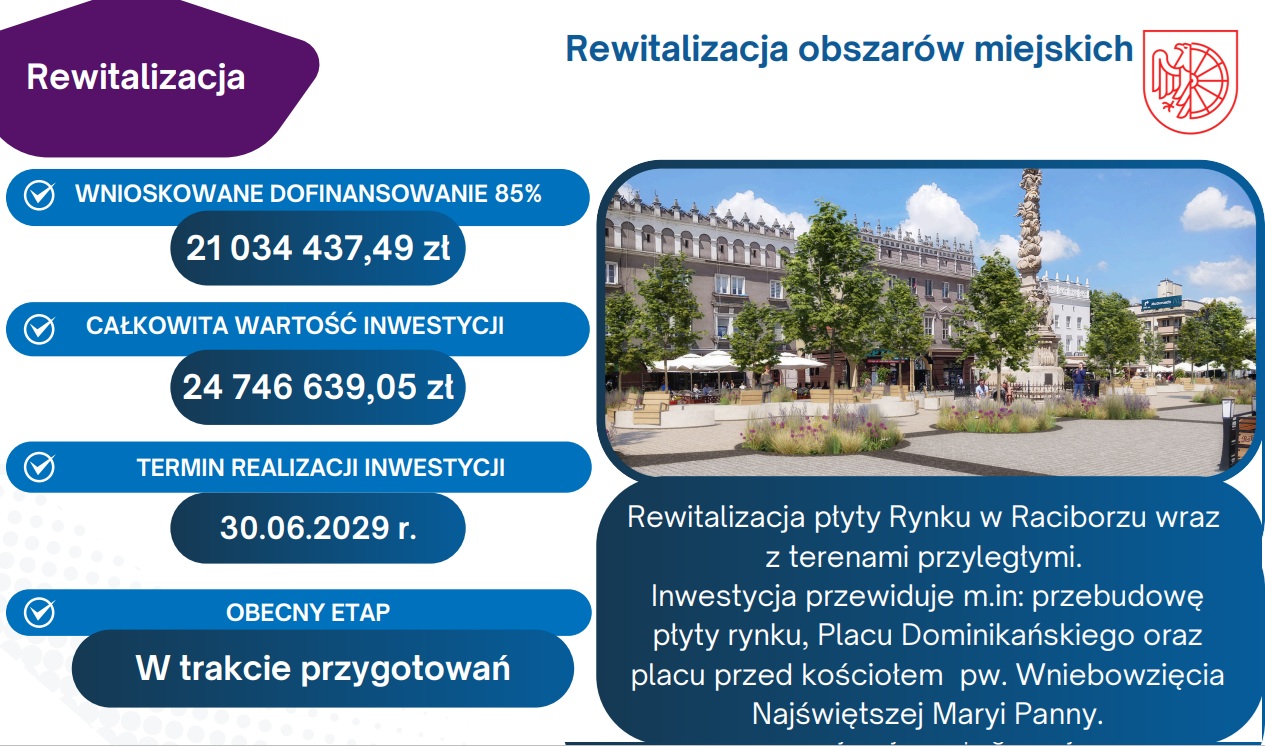 Podczas prezentacji omówiono również inwestycje w turystykę i rekreację, takie jak budowa odcinka Krajowej Trasy Rowerowej nr 3 na trasie Rudnik – Racibórz – Krzyżanowice, rozbudowa Raciborskiego Centrum Aktywnej Integracji Społecznej, modernizacja minizoo w Arboretum Bramy Morawskiej, budowa boiska wielofunkcyjnego przy Zespole Szkolno-Przedszkolnym nr 4 oraz renowacja murów miejskich w rejonie baszty. W planach znajdują się także przedsięwzięcia związane z budownictwem mieszkaniowym, w tym budowa osiedli przy ul. Łąkowej i Słowackiego. Przedstawiono ponadto projekty z zakresu rewitalizacji, ochrony środowiska i bezpieczeństwa obejmujące odnowę wybranych obszarów miejskich, budowę zbiorników retencyjnych w dzielnicy Ocice i przy ul. Wierzyńskiego, opracowanie planów adaptacji do zmian klimatu oraz wdrażanie reform w planowaniu przestrzennym.