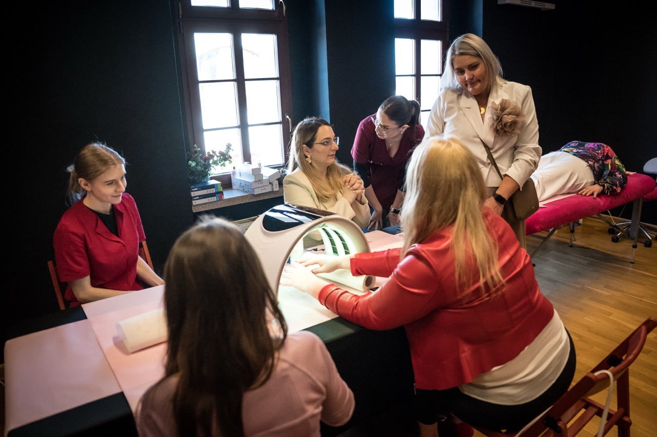 Istotnym elementem wydarzenia była prezentacja nowoczesnego zaplecza technologicznego wykorzystywanego w kosmetologii – szkoła zaprezentowała swoje urządzenia do bioliftingu, endermologii, terapii LED i presoterapii, a także kamery trychologiczne i analizatory skóry twarzy.