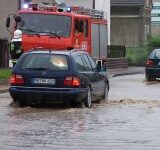 Woda spływająca z pól zalewa ulicę Starowiejską. Na miejscu strażacy kierują ruchem i starają się zapanować nad żywiołem. Mieszkańcy pobliskich domów układają worki z...