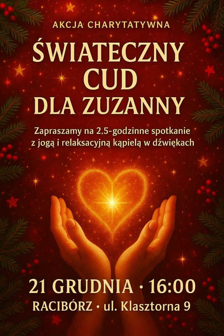 21 grudnia o godz. 16:00 w Powiatowym Centrum Sportu w Raciborzu przy ul. Klasztornej 9 odbędzie się joga i koncert relaksacyjny, podczas którego zabrzmią handpan, misy dźwiękowe i kamertony. Cały dochód ze spotkania zostanie przeznaczony dla 30-letniej Zuzanny, która potrzebuje kolejnej operacji kręgosłupa.