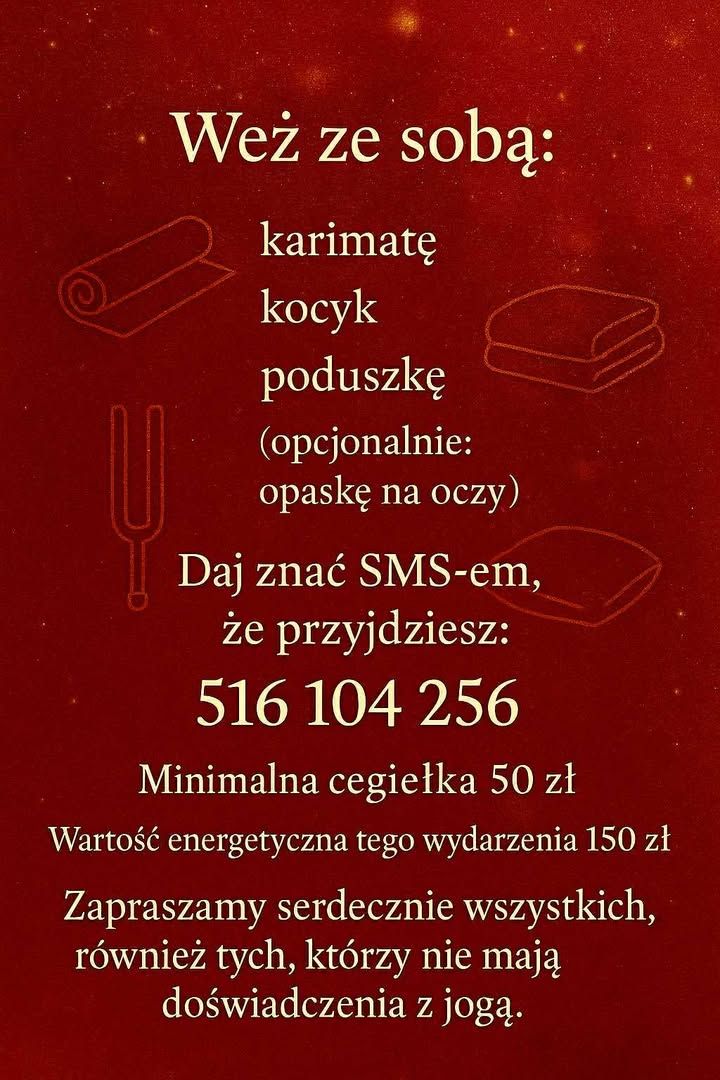 W ramach akcji charytatywnej odbędzie się 2,5-godzinne spotkanie z jogą i relaksacyjną kąpielą w dźwiękach. Należy wziąć ze sobą kamiratę, kocyk i poduszkę. Minimalna cegiełka to 50 zł, a organizatorzy zapraszają również osoby, które nie mają doświadczenia z jogą. Uczestnictwo można zgłaszać SMS-em na nr 516 104 256.