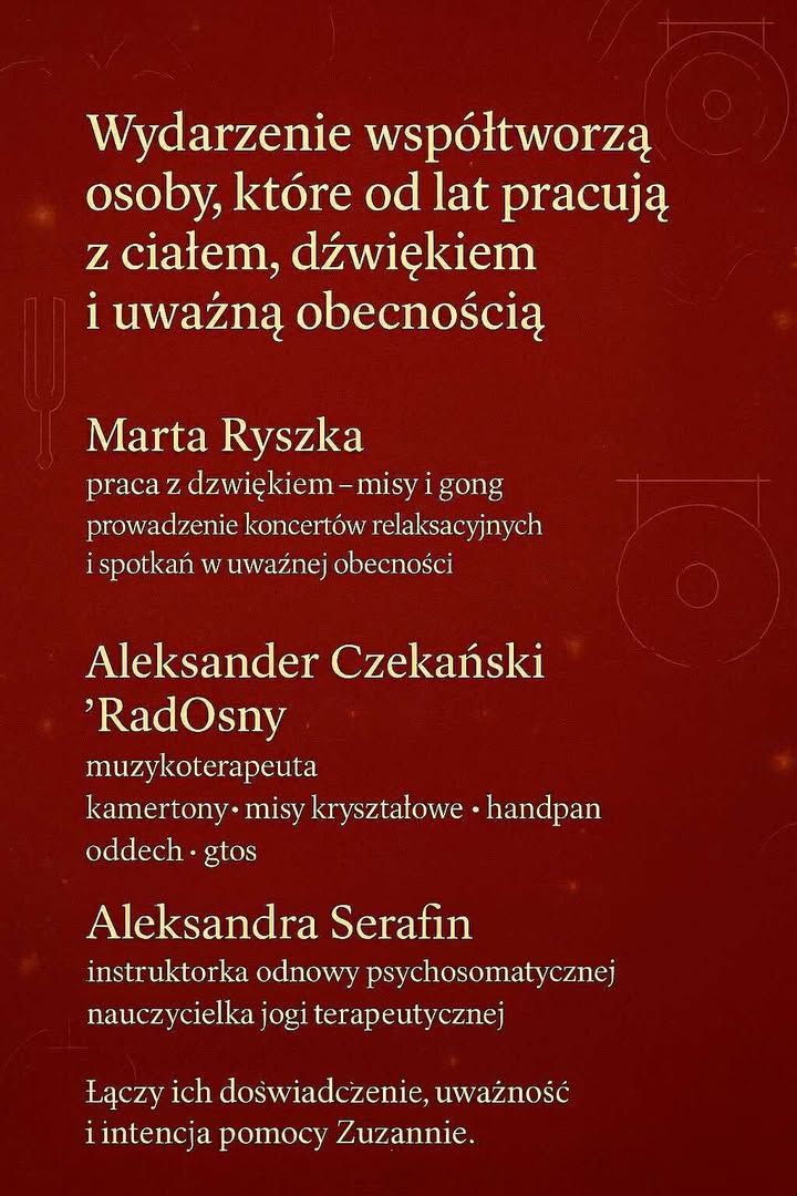 W ramach akcji charytatywnej odbędzie się 2,5-godzinne spotkanie z jogą i relaksacyjną kąpielą w dźwiękach, a dochód zostanie przeznaczony dla 30-letniej Zuzanny, która potrzebuje kolejnej operacji kręgosłupa.