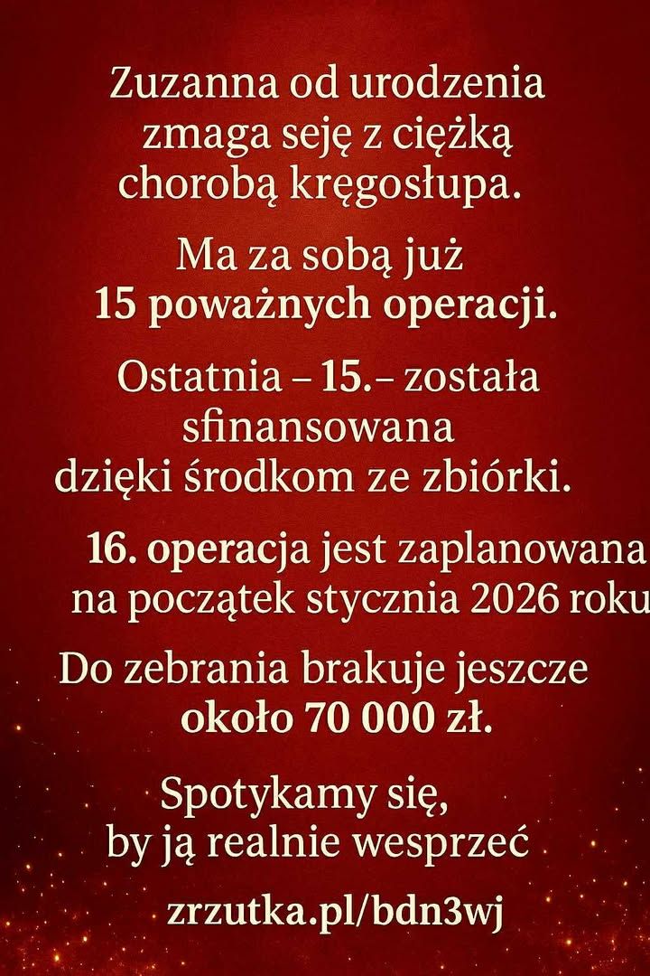 Zuzanna Kowalska od urodzenia zmaga się z ciężką chorobą kręgosłupa. Przepuklina oponowo-rdzeniowa doprowadziła do znacznego skrzywienia kręgosłupa i licznych powikłań zdrowotnych. Do tej pory przeszła 15 poważnych operacji ratujących życie, jednak jej stan nadal się pogarsza. Kręgosłup uciska narządy wewnętrzne, a wydolność oddechowa znacząco spada, co utrudnia codzienne funkcjonowanie i powoduje silny ból. Dodatkowo ciężkie przeżycia, brak akceptacji wśród rówieśników i nieustanny strach o zdrowie sprawiły, że pojawiła się depresja, stany lękowe i nerwica, a rok temu w tragicznym wypadku zginął ukochany chłopak Zuzanny, z którym była przez 7 lat.