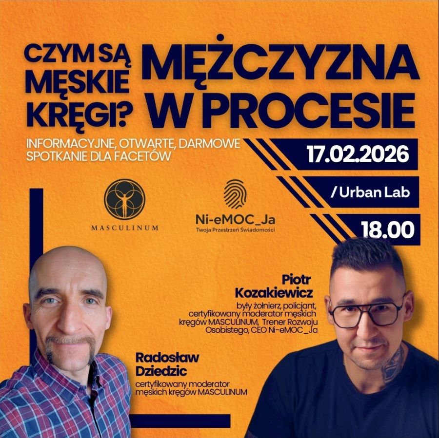17 lutego o godz. 18:00 w Urban Labie w Raciborzu odbędzie się otwarte spotkanie informacyjne pod hasłem „Mężczyzna w procesie” poświęcone idei męskich kręgów. Udział w nim jest bezpłatny i dostępny zarówno dla mężczyzn, jak i kobiet.