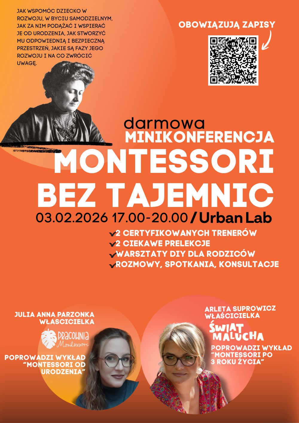 Julia Parzonka, właścicielka Pracowni Montessori, poprowadzi wykład związany z filozofią Marii Montessori u dzieci w wieku 0-3 lata, z kolei Arleta Suprowicz, dyrektor Przedszkola Świat Malucha, opowie o metodach i narzędziach dostępnych dla dzieci w wieku 3-6 lat.