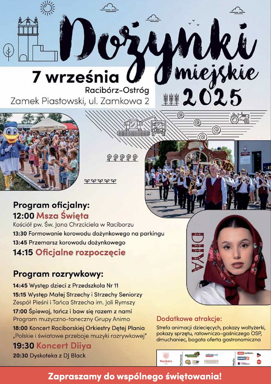 7 września odbędą się dożynki miejskie organizowane przez Miasto Racibórz. Tegorocznym gospodarzem wydarzenia będzie dzielnica Ostróg. Obchody stanowić będą okazję do wspólnego świętowania zakończenia prac żniwnych, wyrażenia wdzięczności za plony oraz podkreślenia znaczenia pracy rolników i lokalnych tradycji.