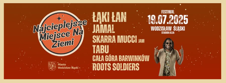 19 lipca w Wodzisławiu Śląskim odbędzie się 22. edycja festiwalu Najcieplejsze Miejsce Na Ziemi. Choć na początku wydarzenie zdominowane było przez brzmienia reggae, to na stałe wpisało się w letni kalendarz miasta jako prawdziwe muzyczne święto łączące różnorodne gatunki i style. W tym roku wystąpią: Łąki Łan, Jamal, Skarra Mucci, Tabu, Cała Góra Barwinków i Roots Soldiers. Bilety na stronie goingapp.pl/wydarzenie/najcieplejsze-miejsce-na-ziemi-2025/wodzislaw-slaski-lipiec-2025. Dzieci do lat 12 – wstęp darmowy (pod opieką rodzica lub opiekuna prawnego). Bilety będzie można również kupić w kasie przy stadionie 19 lipca.