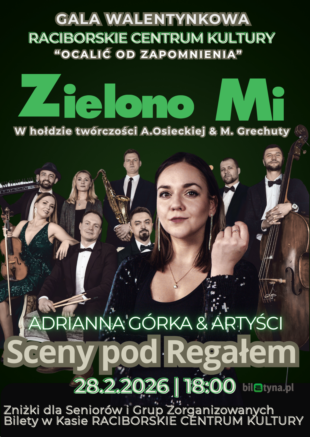 28 lutego o godz. 18:00 w Raciborskim Centrum Kultury odbędzie się Gala Koncertowa „Zielono Mi… Ocalić od Zapomnienia”, podczas której artyści Sceny pod Regałem zaprezentują utwory Agnieszki Osieckiej i Marka Grechuty. W programie znajdą się zarówno dobrze znane przeboje, jak i mniej popularne kompozycje oraz kilka premierowych aranżacji przygotowanych specjalnie na ten koncert. Wystąpi m.in. Adrianna Górka, raciborzanka, laureatka wielu konkursów i uczestniczka „The Voice of Poland”, która wraz z zespołem stworzy wyjątkowy spektakl muzyczny.