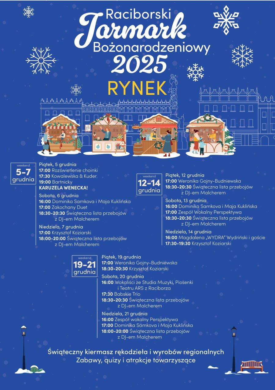 Miasto Racibórz zaprasza do udziału w Jarmarku Bożonarodzeniowym, który odbędzie się w trzy grudniowe weekendy: 5-7, 12-14 i 19-21 grudnia na raciborskim rynku. Inauguracja nastąpi w piątek 5 grudnia o godz. 17:00 uroczystym rozświetleniem choinki, po którym na scenie zaprezentują się Kowalewska & Kuder i zespół Bartnicky. W kolejne dni i weekendy będzie można usłyszeć Dominikę Samkovą i Maję Kuklińską, Zakochany Duet, Krzysztofa Koziarskiego, Weronikę Gojny-Budniewską, Magdalenę „Wydrę” Wydrińską zespół Perspektywa czy wokalistów ze Studia Muzyki, Piosenki i Teatru ARS z Raciborza. Sobotnie i niedzielne wieczory będzie kończyła świąteczna lista przebojów prowadzona przez DJ-a Malchera. Przez cały czas trwania jarmarku odwiedzający będą mogli korzystać ze świątecznego kiermaszu rękodzieła i wyrobów regionalnych, a także uczestniczyć w licznych zabawach, quizach i atrakcjach towarzyszących.