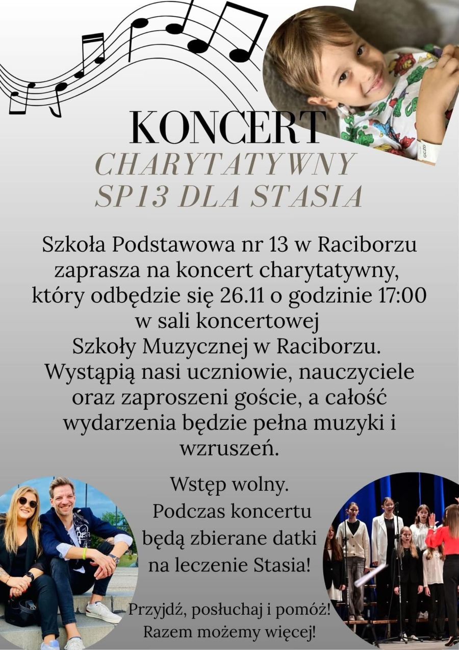 Szkoła Podstawowa nr 13 w Raciborzu zaprasza na koncert charytatywny, który odbędzie się 26 listopada o godz. 17:00 w sali koncertowej Państwowej Szkoły Muzycznej w Raciborzu. Wydarzenie organizowane jest z myślą o wsparciu leczenia Stasia, a jego ideą jest połączenie pomocy z muzycznym spotkaniem pełnym emocji i dobrej energii.
