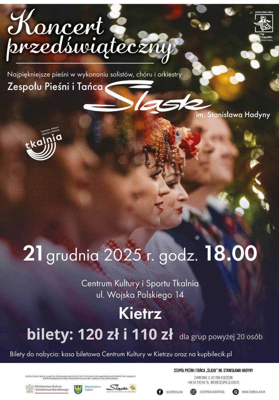 Centrum Kultury i Sportu w Kietrzu zaprasza na przedświąteczny koncert Zespołu Pieśni i Tańca Śląsk, który odbędzie się 21 grudnia o godz. 18:00. Wydarzenie będzie okazją do spotkania z jedną z najważniejszych instytucji artystycznych w Polsce, od ponad siedmiu dekad promującą rodzimy folklor na scenach krajowych i zagranicznych. Bilety są dostępne w kasie CKiS oraz online: www.kupbilecik.pl/imprezy/186261/Kietrz/Zesp%C3%B3%C5%82+Pie%C5%9Bni+i+Ta%C5%84ca+%22%C5%9Al%C4%85sk%22/?.