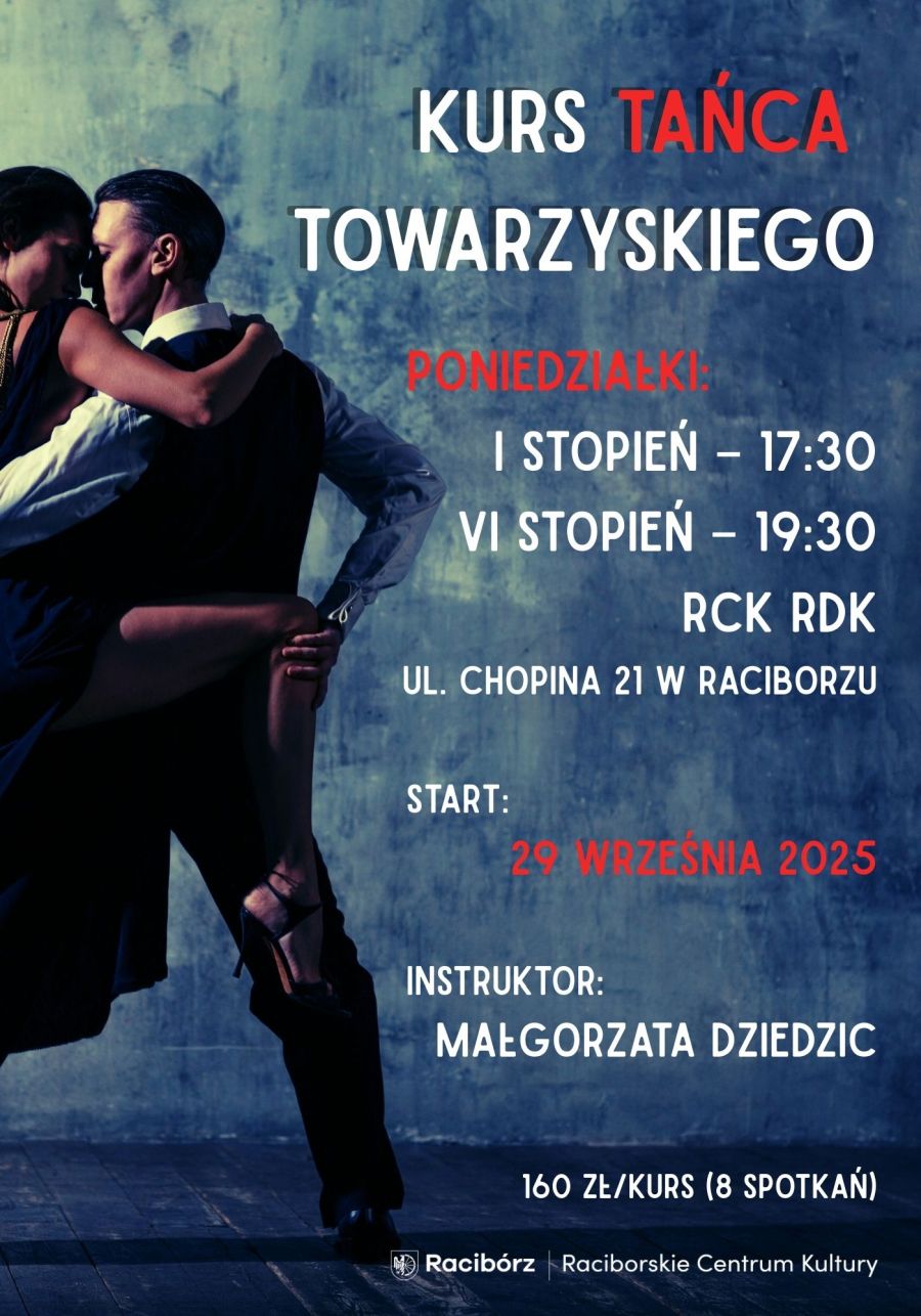 Raciborskie Centrum Kultury zaprasza młodzież i dorosłych na kurs tańca towarzyskiego, który rozpocznie się 29 września (poniedziałek) w RCK RDK przy ul. Chopina 21. Zajęcia odbywać się będą w dwóch grupach: I stopień – godz. 17:30 i VI stopień – godz. 19:30.