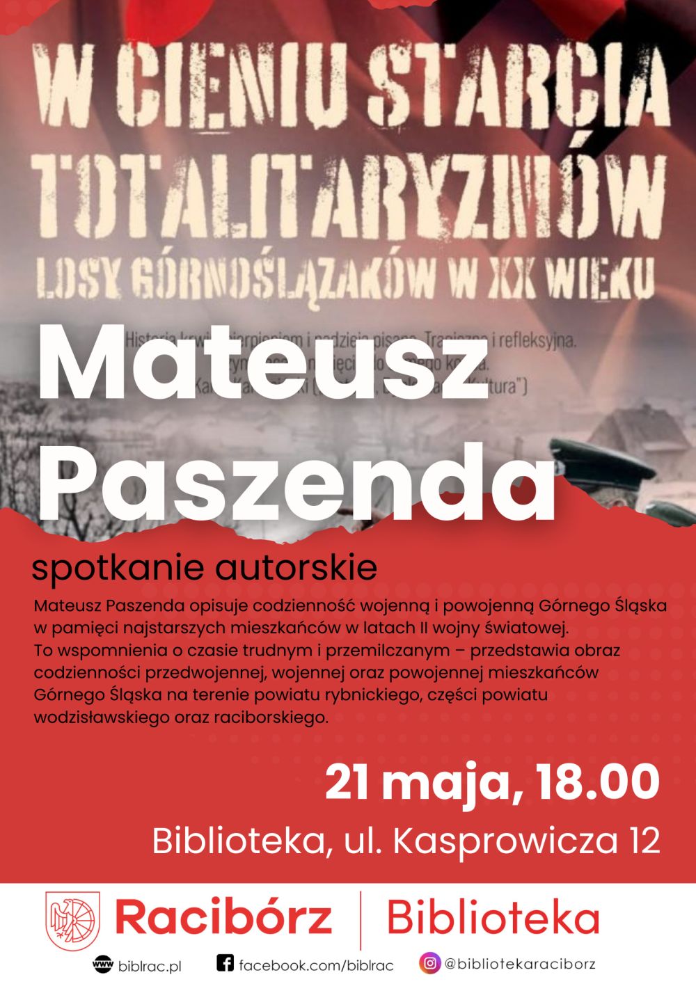 Miejska i Powiatowa Biblioteka Publiczna w Raciborzu zaprasza wszystkich miłośników historii na spotkanie autorskie z Mateuszem Paszendą promujące jego najnowszą książkę pt. „W cieniu starcia totalitaryzmów. Losy Górnoślązaków w XX wieku”. Wydarzenie odbędzie się 21 maja o godz. 18:00 w siedzibie biblioteki przy ul. Kasprowicza 12. Wstęp jest wolny.