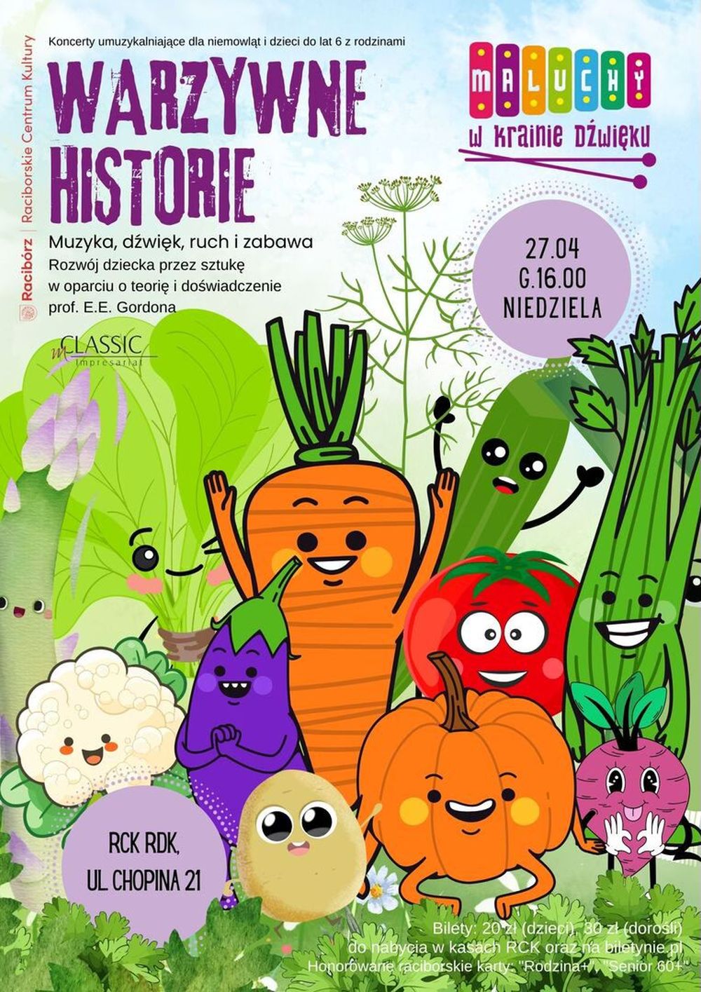 27 kwietnia o godz. 16:00 w sali kameralnego Raciborskiego Centrum Kultury przy ul. Chopina 21 na dzieci będą czekały nowe muzyczne doświadczenia w ramach koncertu z cyklu „Maluchy w krainie dźwięku”. Tym razem bajkowym tematem przewodnim będą „Warzywne historie”. Bilety w cenie 20 zł (dzieci) i 30 zł (dorośli) do nabycia w kasach RCK oraz na rck.com.pl/kup_bilet. Honorowane są raciborskie karty: Rodzina+ i Senior 60+.