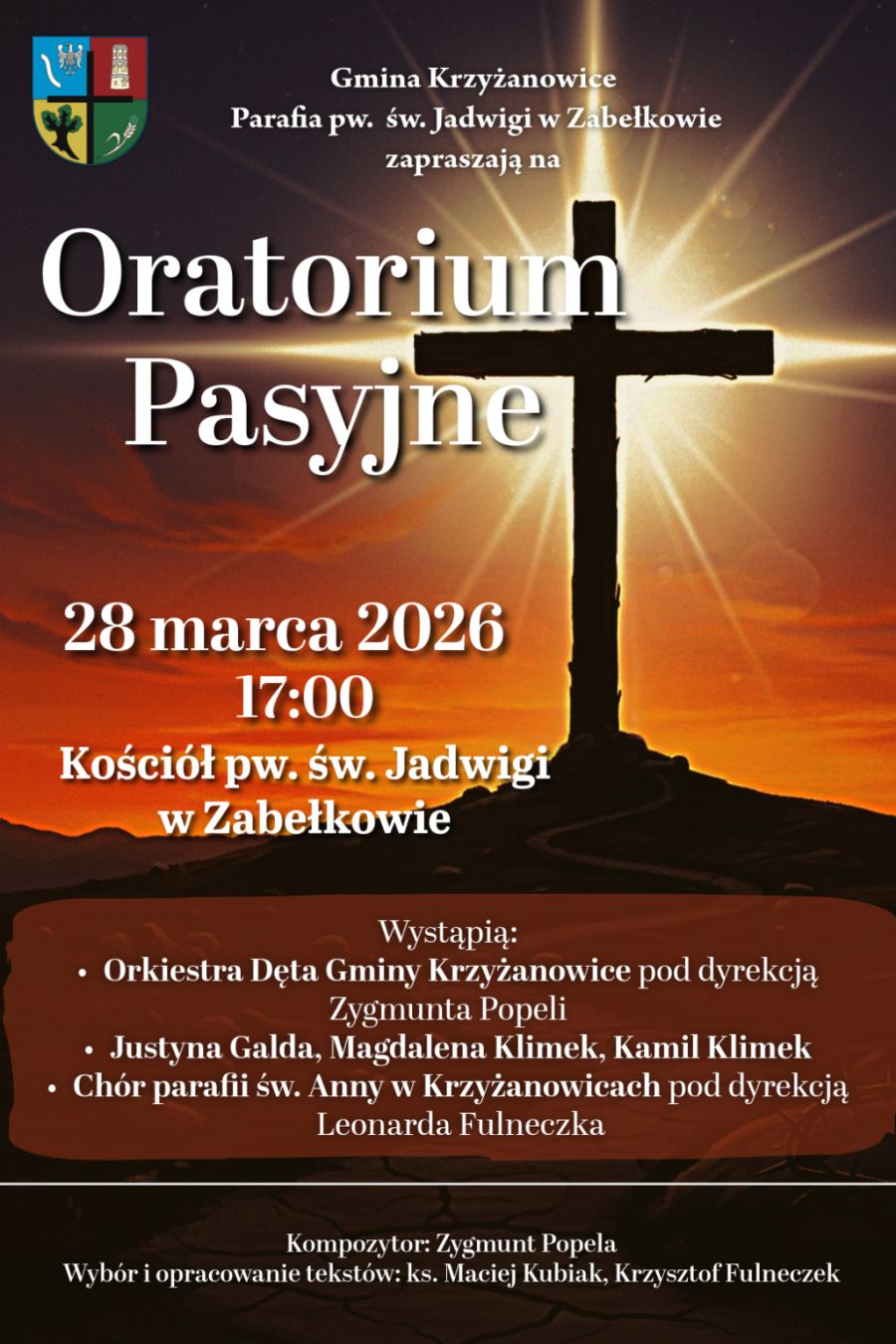 28 marca o godz. 17:00 w kościele pw. św. Jadwigi w Zabełkowie odbędzie się oratorium pasyjne. Podczas koncertu publiczność będzie mogła wysłuchać utworów przygotowanych specjalnie z myślą o okresie wielkopostnym. Kompozytorem oratorium jest Zygmunt Popela, który jednocześnie poprowadzi Orkiestra Dętą Gminy Krzyżanowice. W wydarzeniu wezmą udział również soliści: Justyna Galda, Magdalena KlimekKamil Klimek. Na scenie wystąpi także chór parafii św. Anny w Krzyżanowicach, którym dyryguje Leonard Fulneczek. Warstwa tekstowa oratorium została opracowana przez ks. Macieja Kubiaka i Krzysztofa Fulneczka.