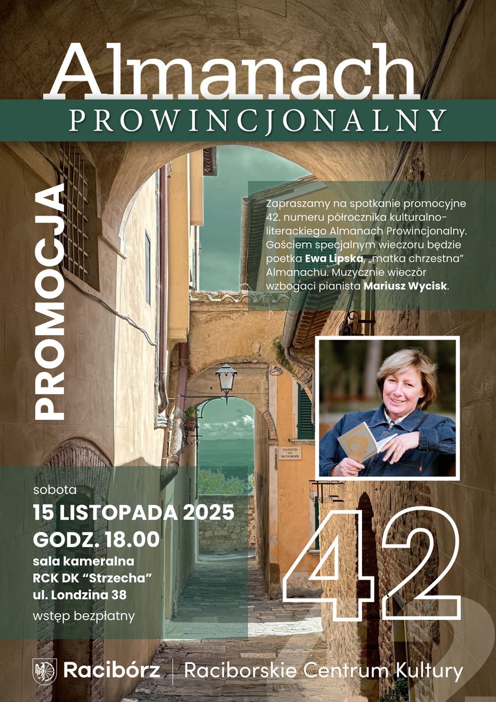 15 listopada o godz. 18:00 Raciborskie Centrum Kultury zaprasza do Domu Kultury Strzecha na wydarzenie promocyjne związane z premierą 42. wydania „Almanachu Prowincjonalnego”. Gościem specjalnym spotkania będzie Ewa Lipska – jedna z najważniejszych polskich poetek współczesnych pełniąca symboliczną rolę „matki chrzestnej” raciborskiego półrocznika literacko-kulturalnego. Wstęp na spotkanie jest bezpłatny.