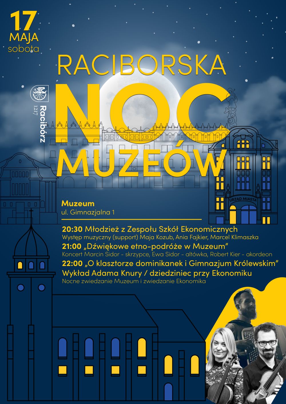 Natomiast w Muzeum w Raciborzu od godz. 20:30 zaplanowano: występ młodzieży z Zespołu Szkół Ekonomicznych (Maja Kozub, Ania Fajkier, Marcel Klimaszka), koncert „Dźwiękowe etno-podróże w Muzeum” w wykonaniu Marcina Sidora (skrzypce), Ewy Sidor (altówka) i Roberta Kiera (akordeon) i wykład Adama Knury pt. „O klasztorze dominikanek i Gimnazjum Królewskim” na dziedzińcu przy Ekonomiku. Będzie też można zwiedzić Muzeum i Ekonomik.