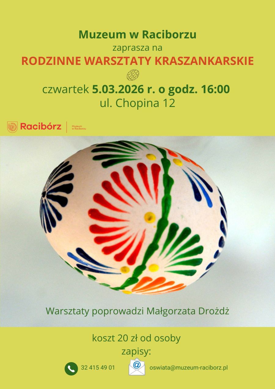 Muzeum w Raciborzu zaprasza do udziału w rodzinnych warsztatach kraszankarskich, podczas których będzie można poznać tradycyjne techniki zdobienia jajek wielkanocnych. Wydarzenie odbędzie się w czwartek 5 marca o godz. 16:00 w siedzibie muzeum przy ul. Chopina 12.