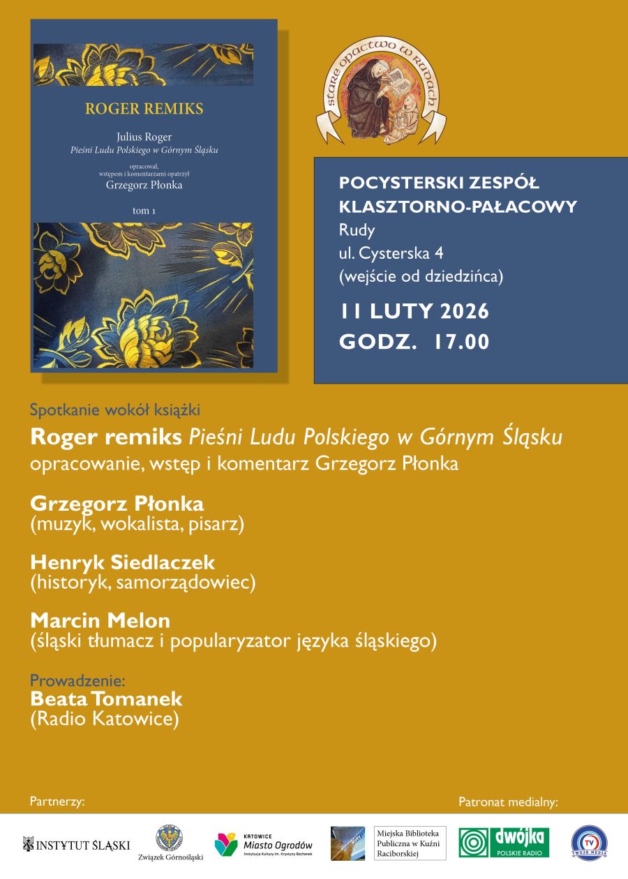 Biblioteka w Rudach zaprasza na spotkanie poświęcone książce i muzyce Górnego Śląska, które odbędzie się 11 lutego o godz. 17:00 w przestrzeni Pocysterskiego Zespołu Klasztorno-Pałacowego w Rudach przy ul. Cysterskiej 4 (wejściem od dziedzińca). Wydarzenie będzie okazją do rozmowy wokół publikacji „Roger remiks. Pieśni Ludu Polskiego w Górnym Śląsku” stanowiącej nowatorskie opracowanie twórczości Juliusza Rogera przygotowane przez Grzegorza Płonkę.