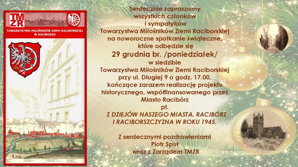 29 grudnia o godz. 17:00 odbędzie się noworoczne spotkanie świąteczne Towarzystwa Miłośników Ziemi Raciborskiej. Organizatorzy zapraszają członków i sympatyków organizacji.