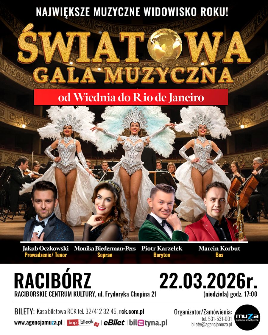 Publiczność w Raciborzu czeka wieczór wypełniony dźwiękami z różnych stron świata. Program koncertu obejmuje zarówno majestatyczne walce wiedeńskie i znane arie operetkowe, jak i nastrojowe tanga argentyńskie oraz pełne temperamentu przeboje greckie, hiszpańskie i włoskie. – „Światowa Gala Muzyczna. od Wiednia do Rio de Janeiro” to prawdziwe święto muzyki – pełne pasji, nostalgii, zachwytu i radości życia – zapowiadają organizatorzy.