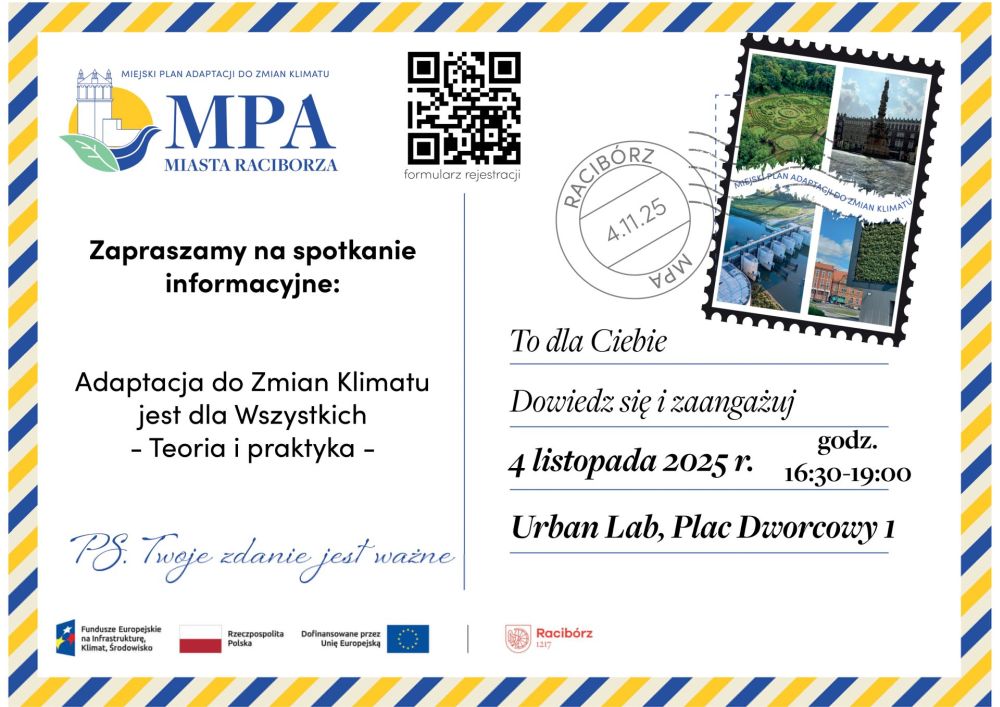 4 listopada o godz. 16:30 w w Urban Labie w Raciborzu odbędzie się szkolenie „Miejski Plan Adaptacji do zmian klimatu. Teoria i praktyka”. W trakcie spotkania omówione zostaną takie tematy, jak adaptacja do zmian klimatu, dobre praktyki i zachowania oraz działania adaptacyjne. Zapisy na stronie www.docs.google.com/forms/d/e/1FAIpQLSepNa-6DbDIbrnSgJ8t4noQKD_6qkDGe8xa7w-6ohYa4Sc4-w/viewform.