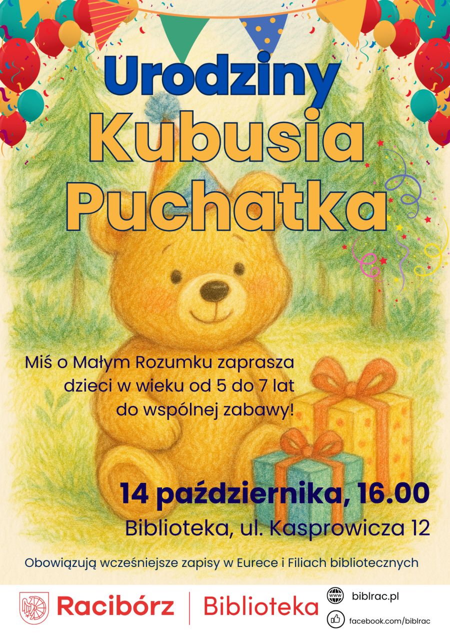 Miejska i Powiatowa Biblioteka Publiczna w Raciborzu zaprasza najmłodszych czytelników na urodziny Kubusia Puchatka. Spotkanie dla dzieci w wieku 5–7 lat odbędzie się 14 października o godz. 16:00 w Eurece – Wypożyczalni dla Dzieci i Młodzieży przy ul. Kasprowicza 12.