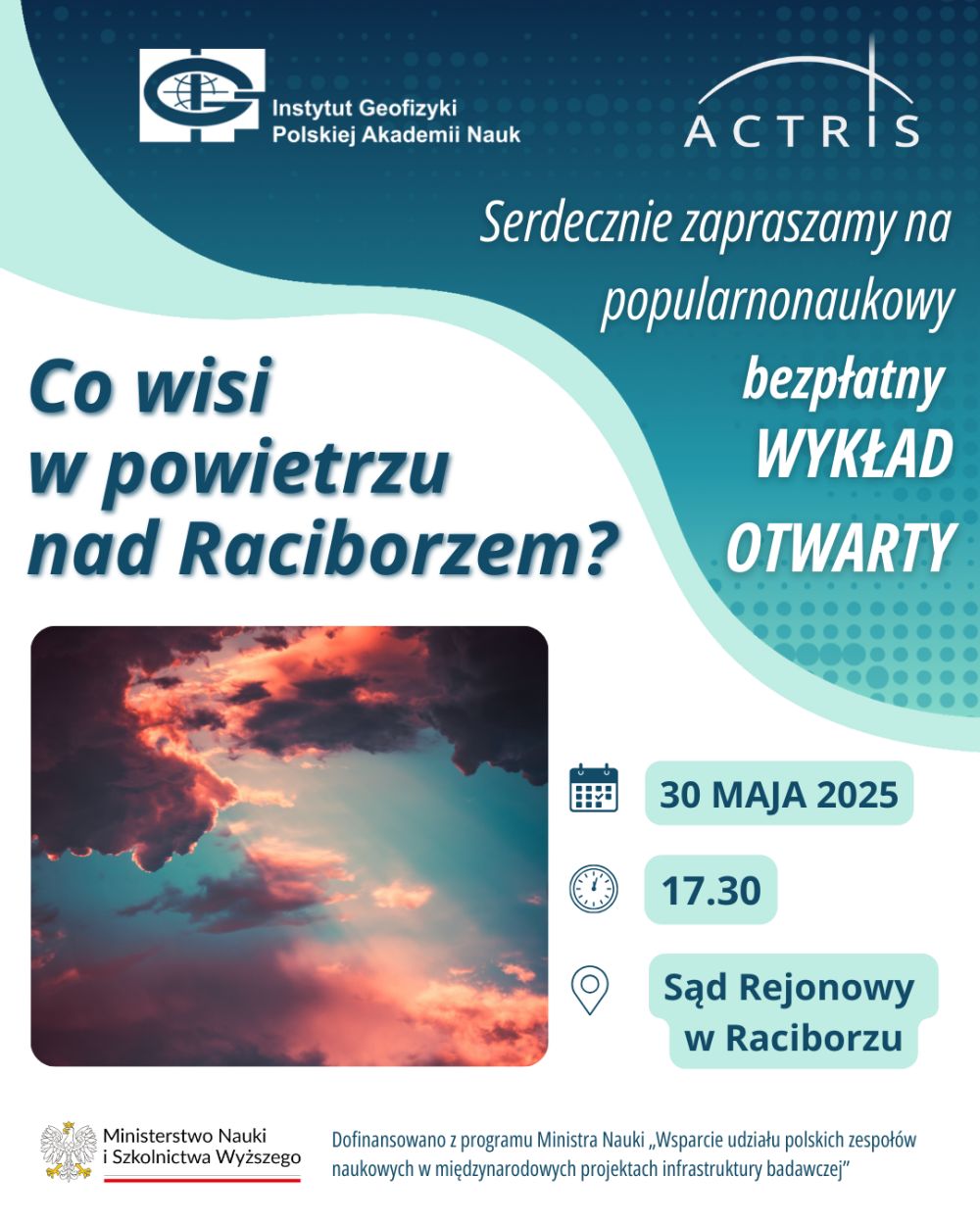 30 maja o godz. 17:30 w Sądzie Rejonowym w Raciborzu przy ul. Nowej 29 odbędzie się wykład popularnonaukowy pt. „Co wisi w powietrzu nad Raciborzem?” . Wydarzenie zostanie zorganizowane w ramach ogólnopolskiego projektu badawczego ACTRIS-PL i będzie okazją, aby zgłębić tajniki jakości powietrza, zmian klimatycznych i nowoczesnych metod badawczych.